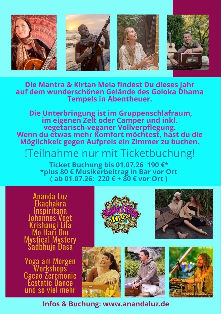 Bei der Mantra und Kirtan Meta kannst Du den ganzen Tag und meist bis spät in die Nacht in Kirtan Vibes baden… alles ist und dreht sich um spirituelle Musik , vier Tage Bliss …diesmal in Abentheuer.